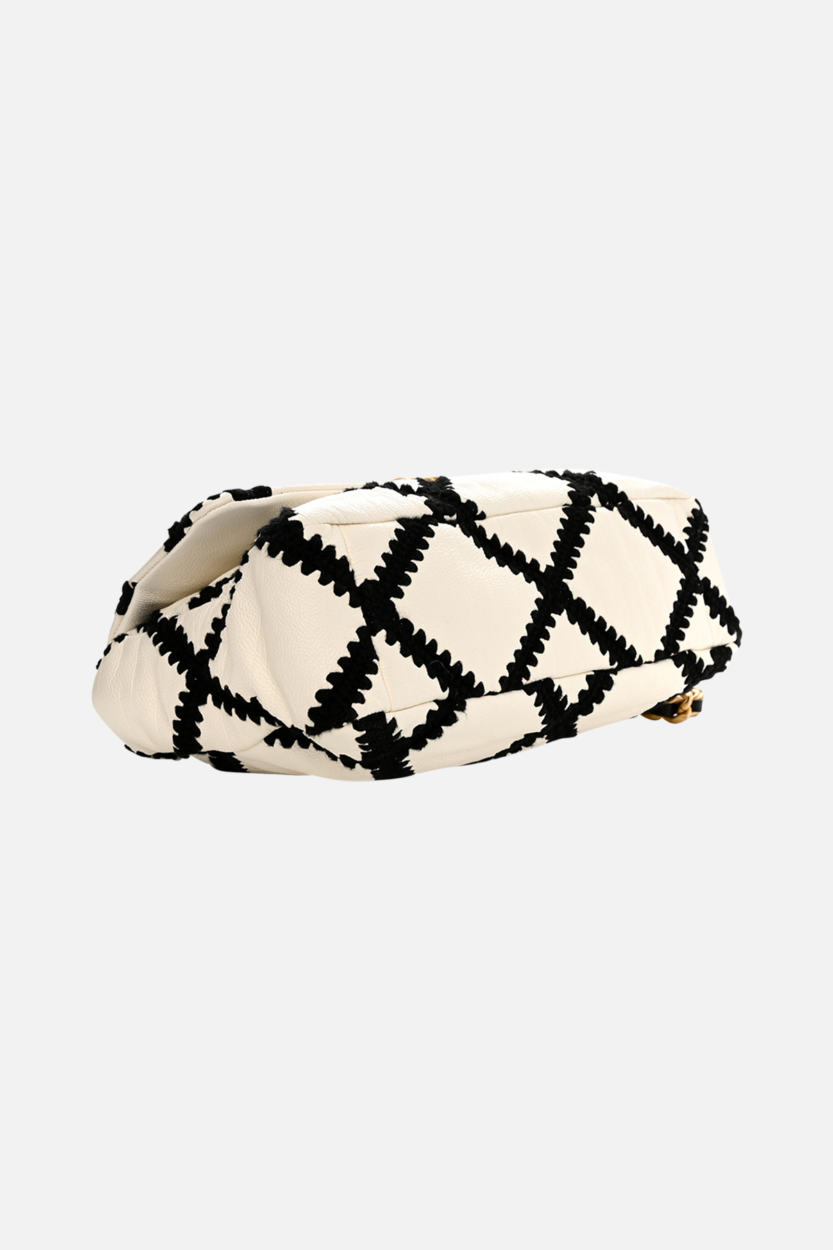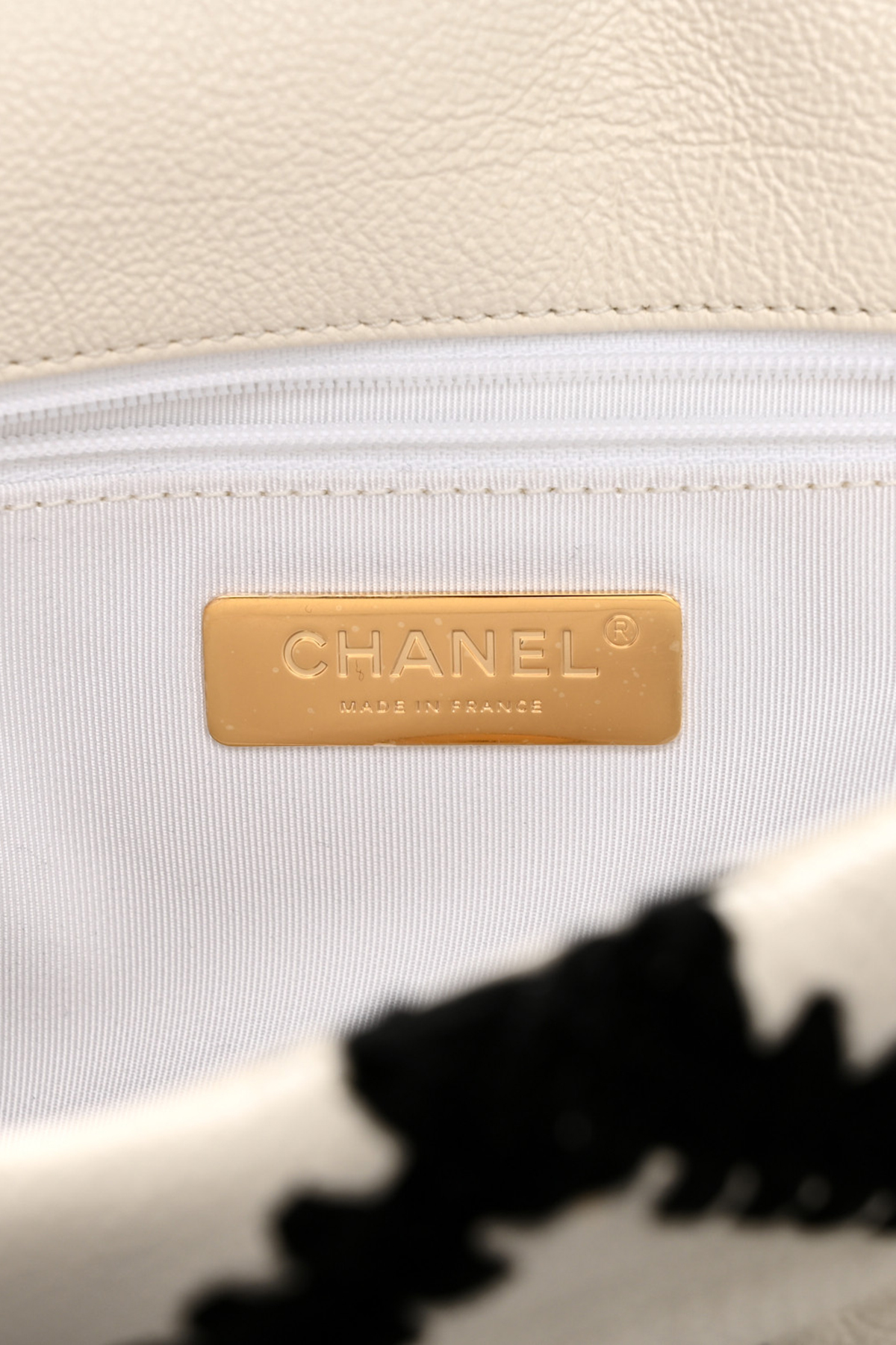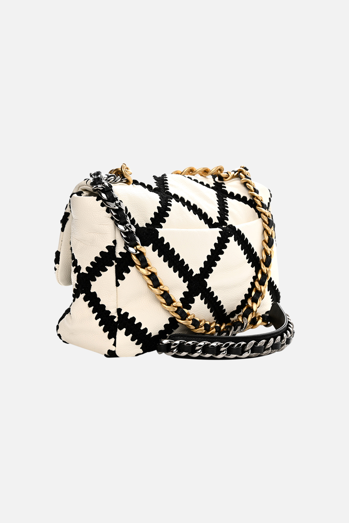 Chanel 19 Large Flap Bag from the 2020 Collection. White calfskin with signature diamond quilting in black crochet. Interlocking CC logo & chain-link accent, multi tonal hardware, chain-link handle and chain-link shoulder strap. Single exterior and interior pocket, grosgrain lining and turn-lock closure at front. Includes authenticity card.
