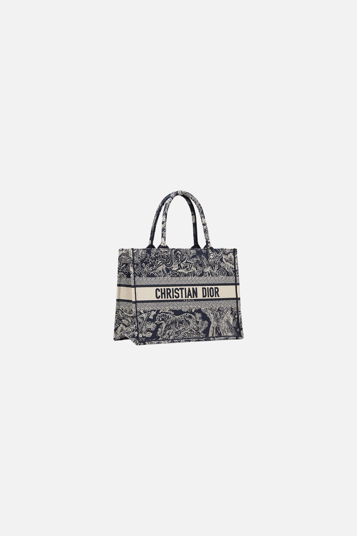Christian Dior Medium Dior Book Tote embroidered with the blue and ecru Toile de Jouy Reverse motif. Christian Dior Paris signature on the front. Rolled handles and open top. Includes dust bag.